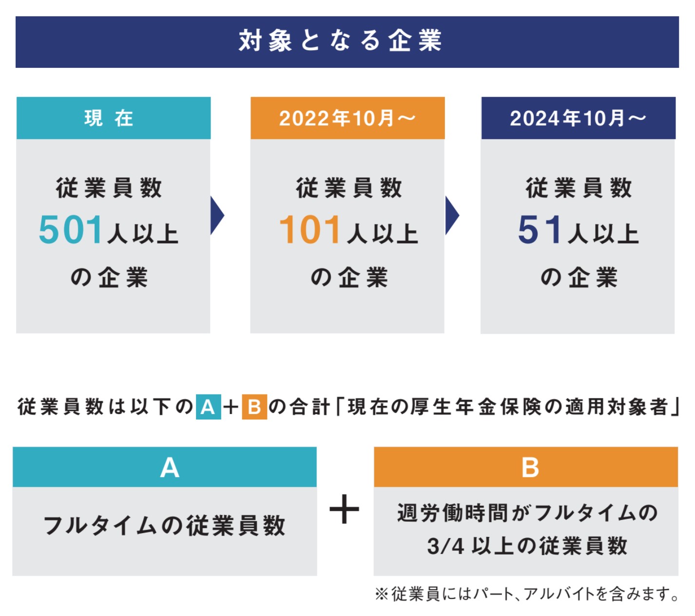 この改正法は、企業規模に応じて段階的に適用されています。現状は従業員数が常時501人以上の企業が適用対象ですが、2022年10月からは「従業員数が常時101人以上」の企業が適用対象となります。